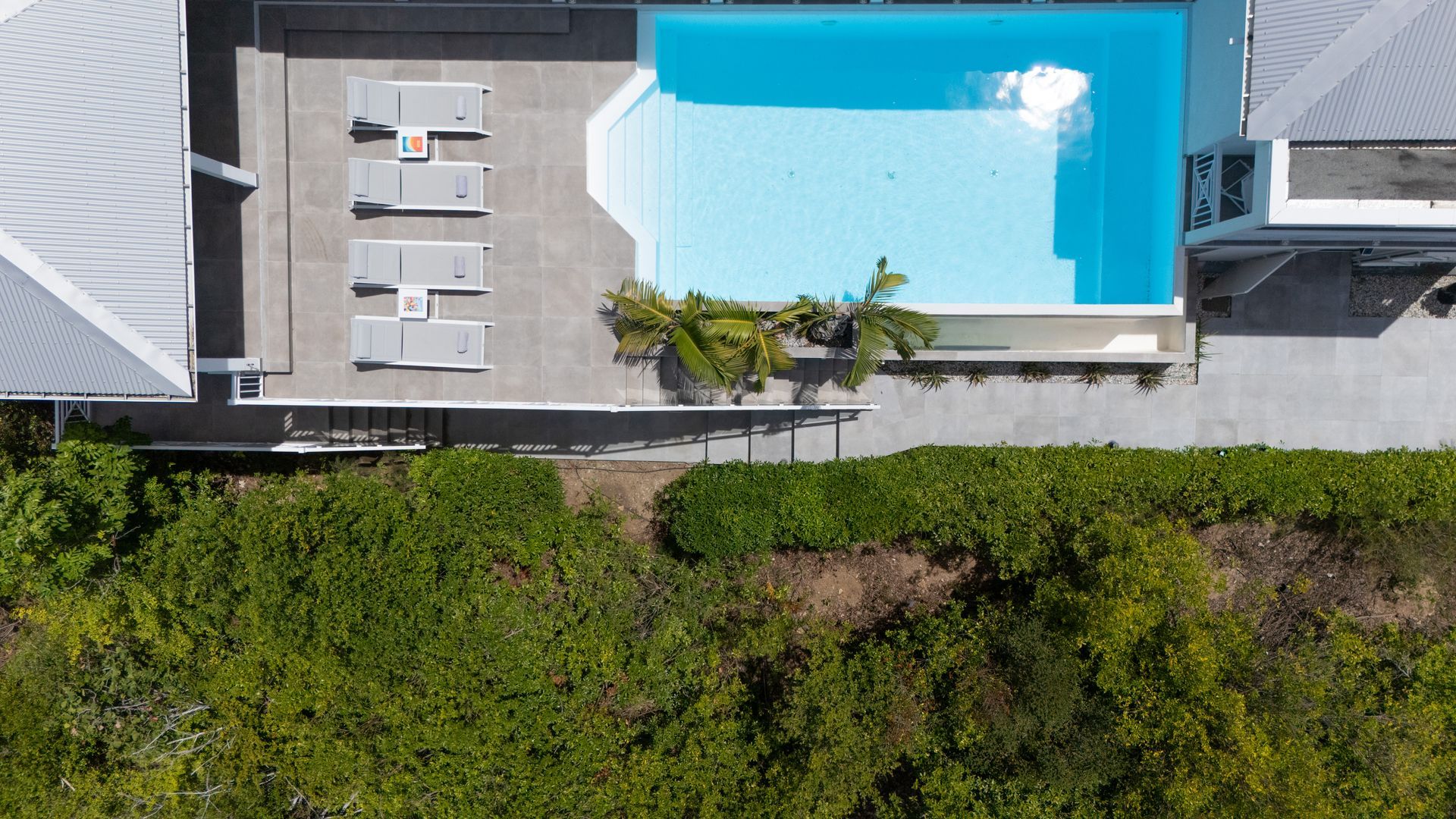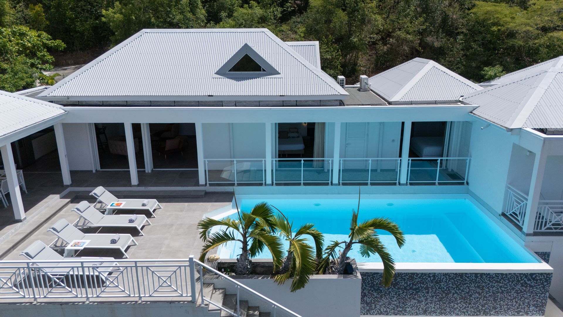 Depuis la vaste terrasse, profitez de la magnifique piscine à débordement et admirez la vue panoramique sur les Terres Basses, la Baie Rouge et l'historique La Belle Créole.
