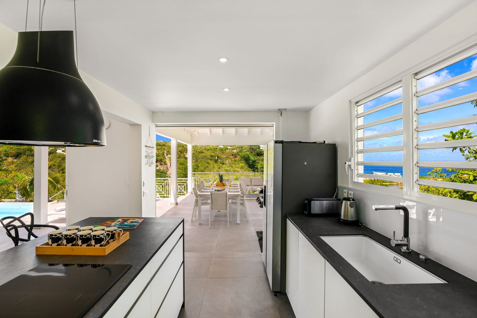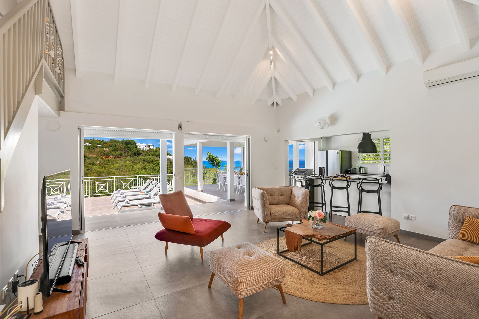 Depuis cet espace de vie, sortez sur la vaste terrasse avec une vue panoramique à couper le souffle sur les Terres Basses, Baie Rouge et La Belle Créole.