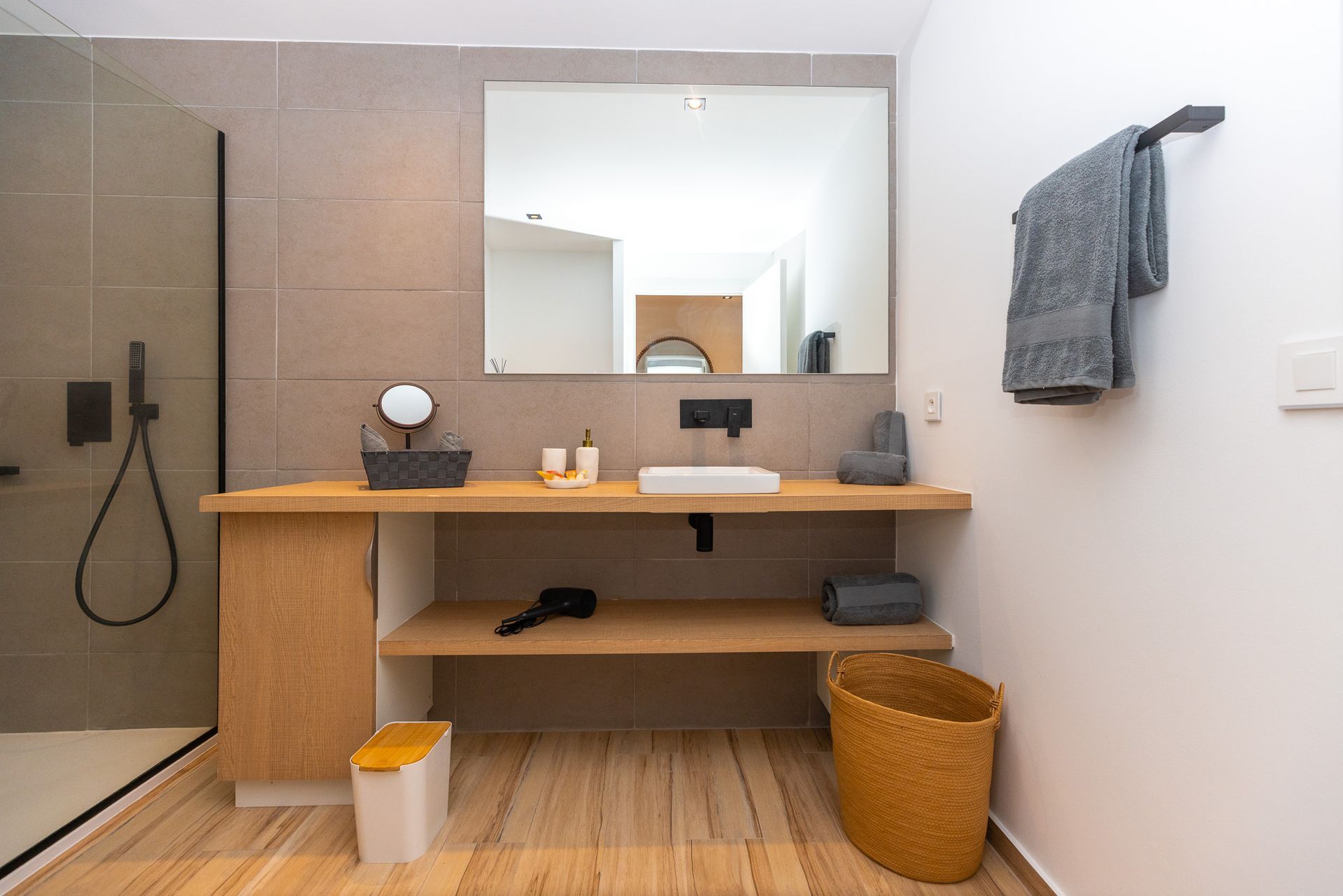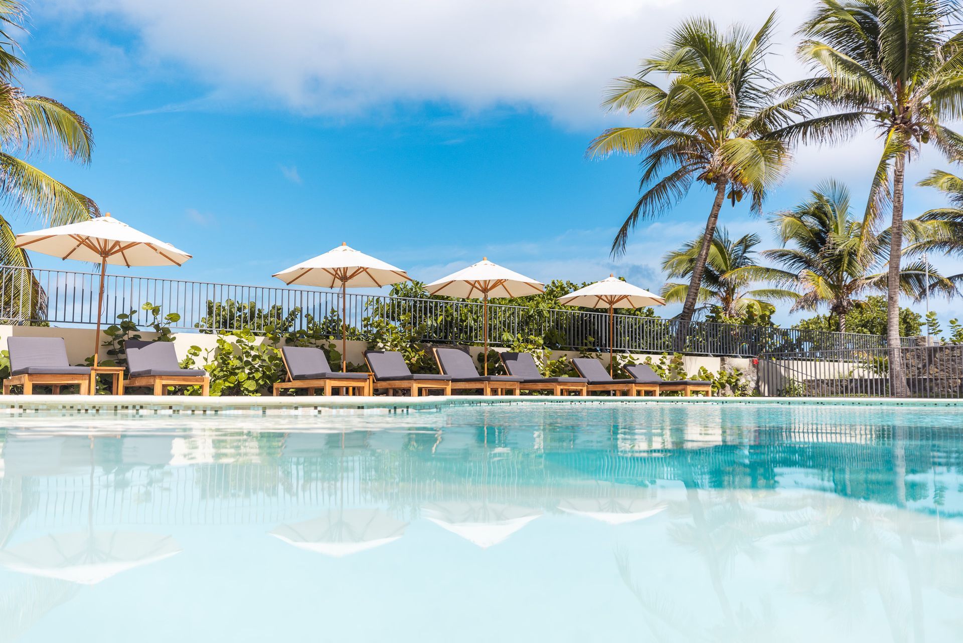 Guests have 24/7 access to the shared swimming pool, complete with lounge chairs and umbrellas, a calm and sunny spot to relax at any time.