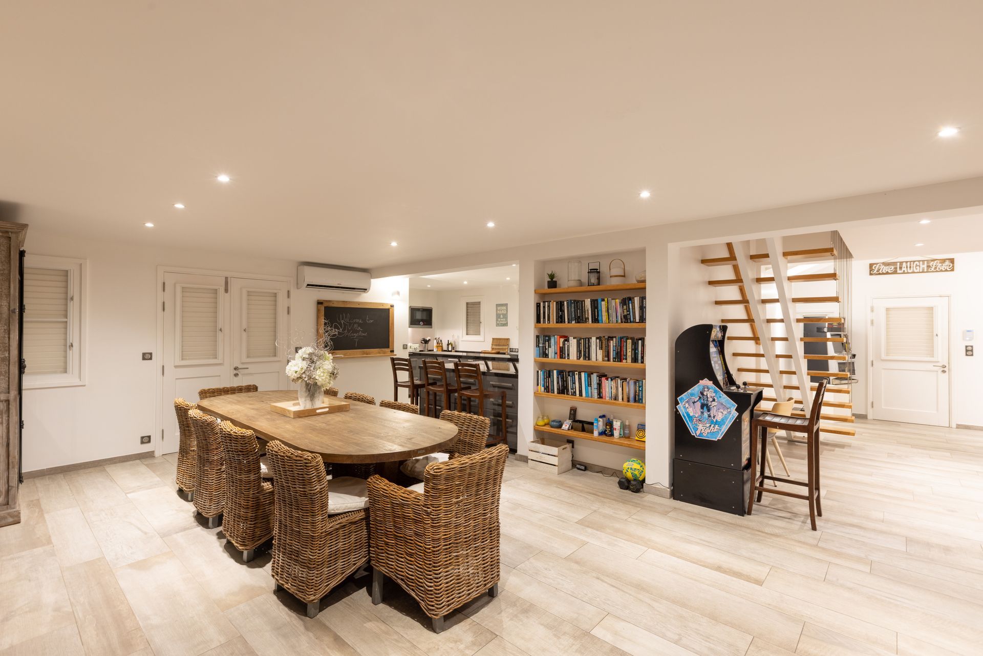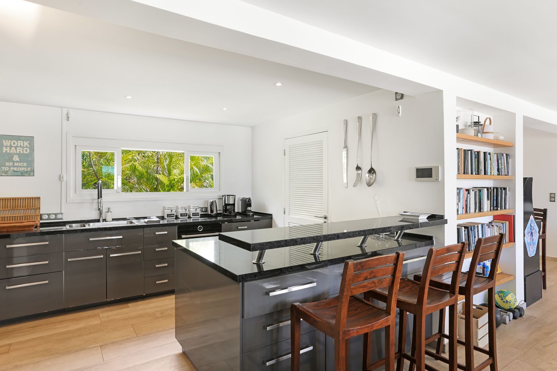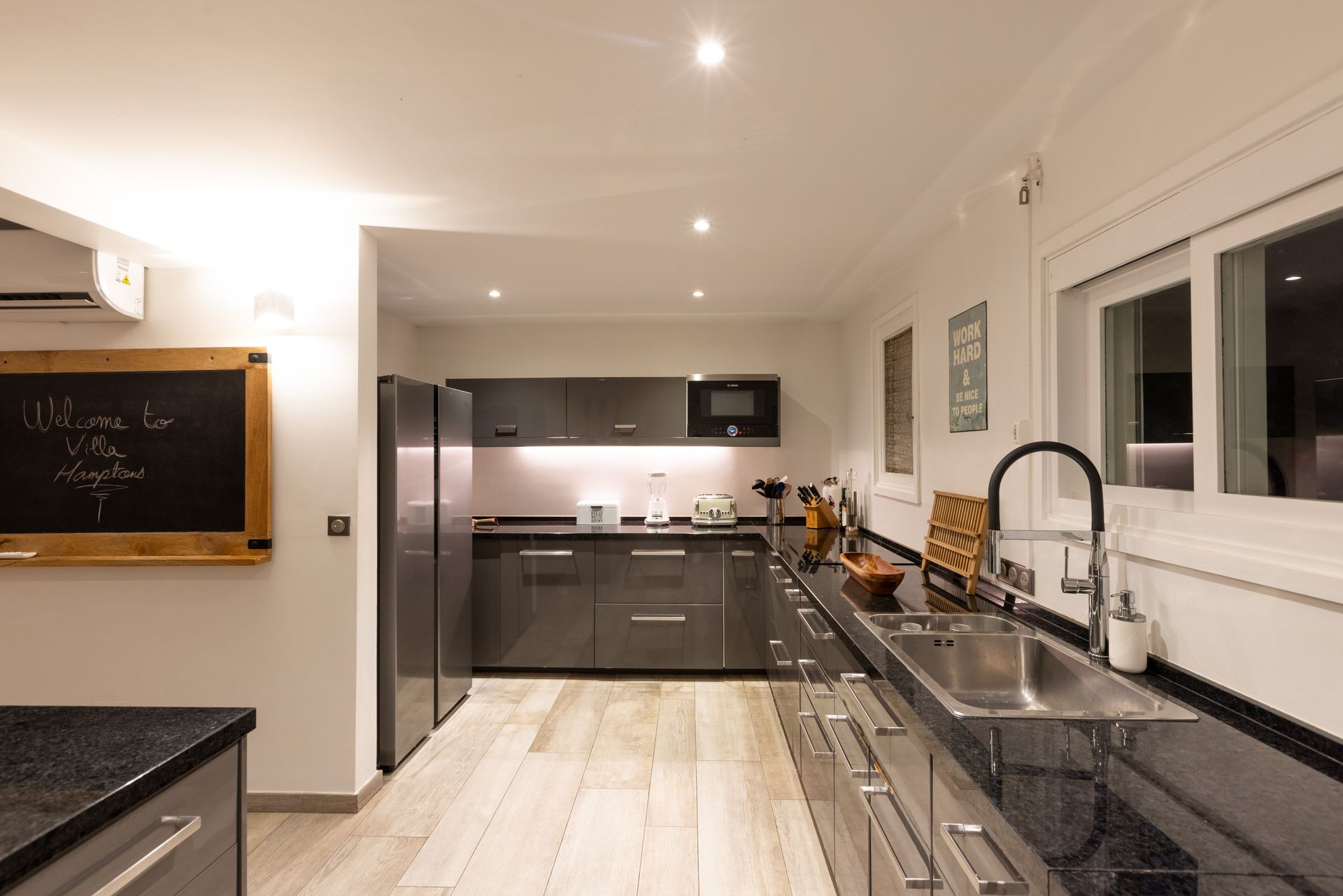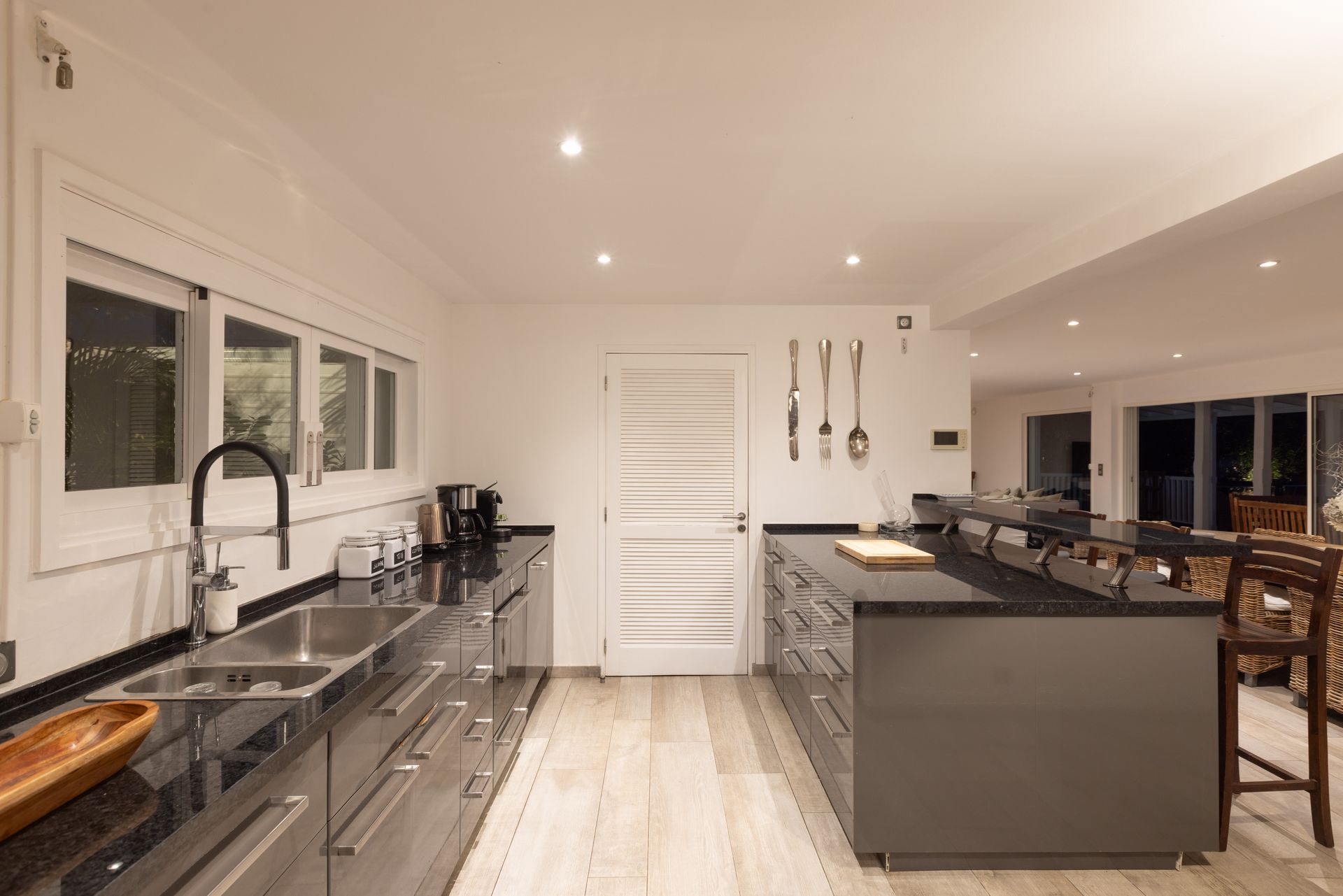 The villa is built around a central bar and an open-plan, fully equipped kitchen.