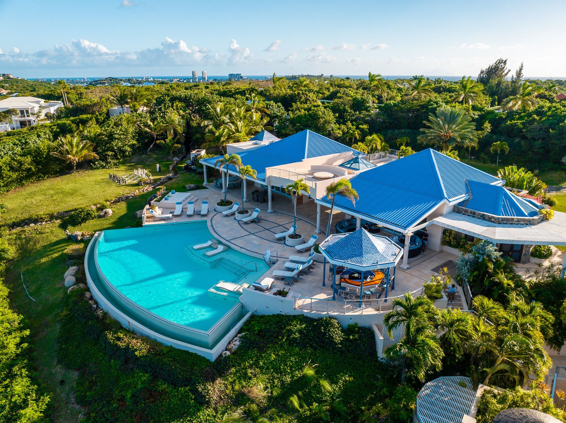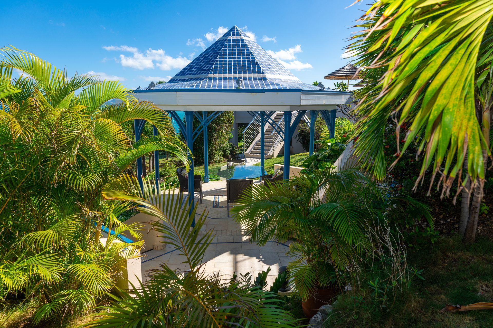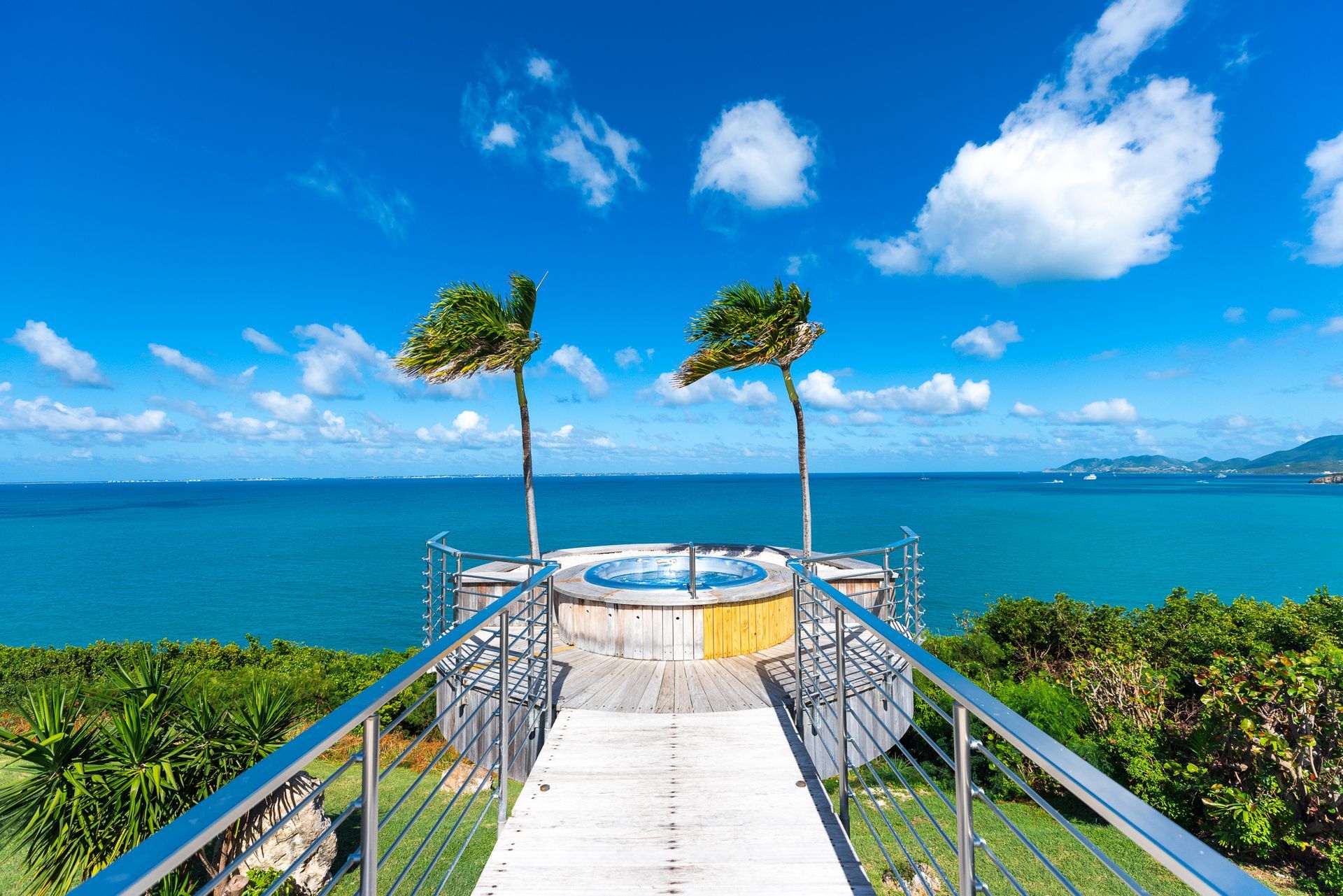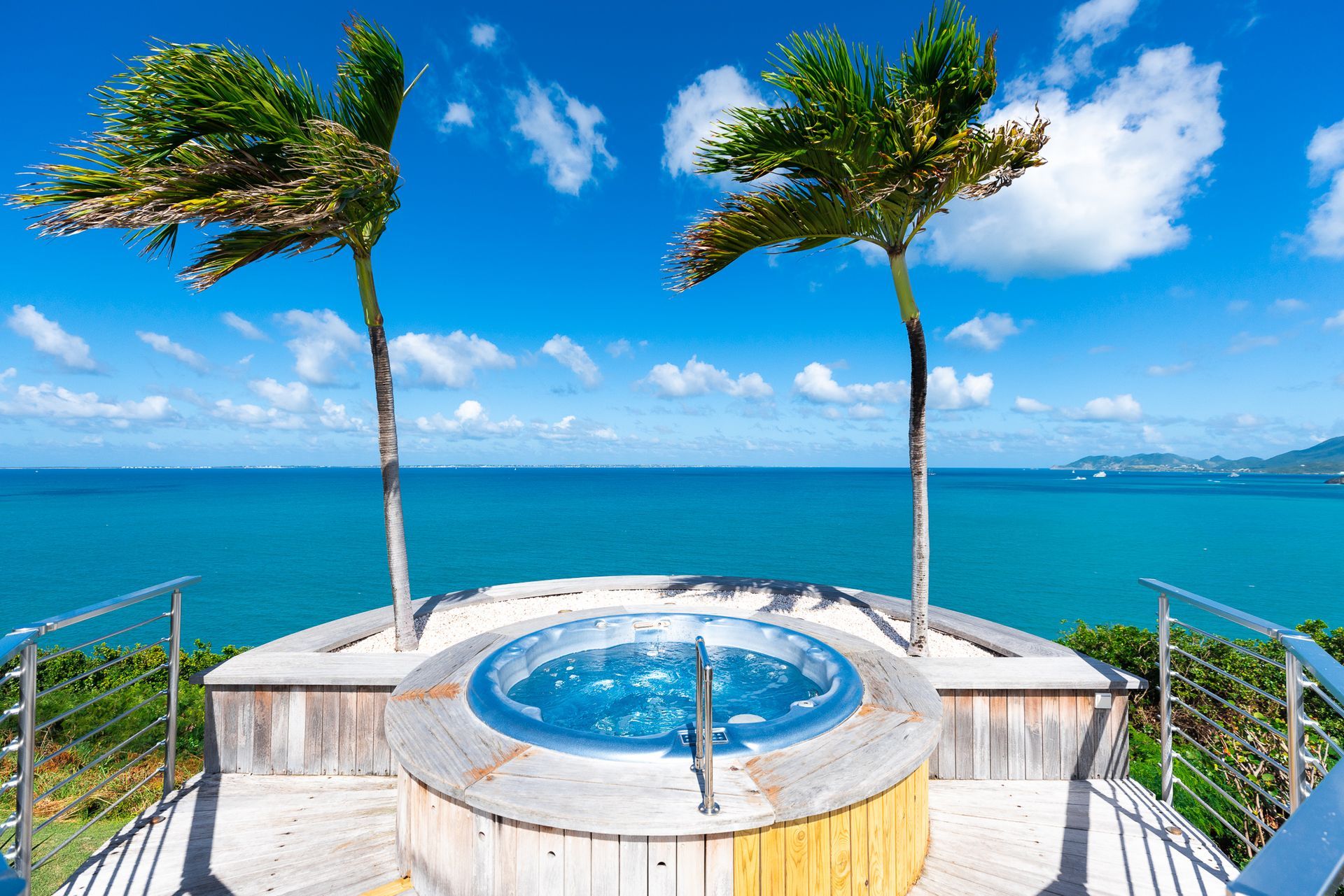 Set within a lush 20,000 m² tropical garden, the property offers an exceptional vacation experience featuring two swimming pools, a jacuzzi with panoramic views of the Caribbean Sea and Anguilla, a volleyball court, and a rooftop terrace.